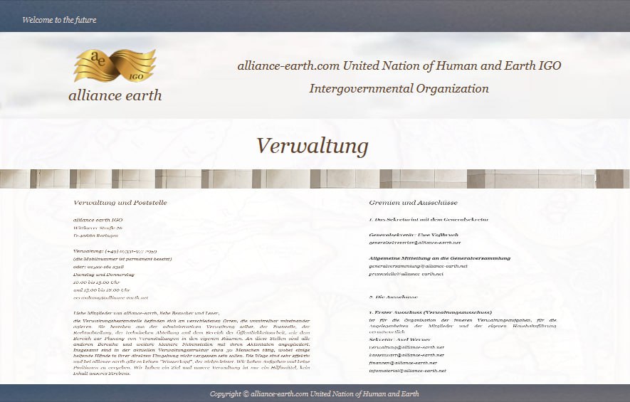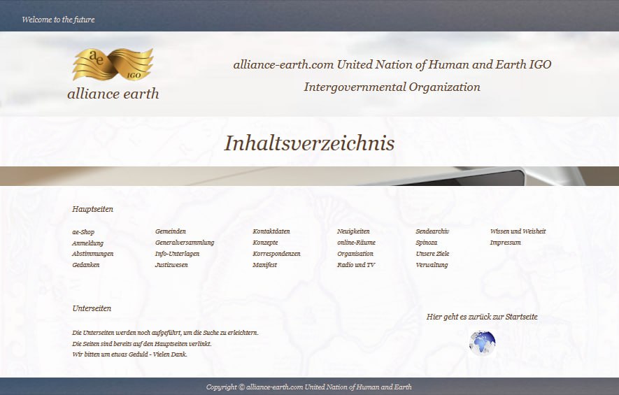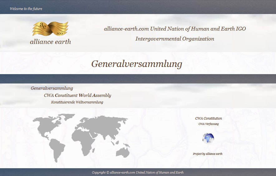 alliance-earth.com ist eine moderne und der Welt zugewandte, internationale und globale Organisation, die dennoch Platz für Besinnlichkeit, Güte, Menschlichkeit und ein tiefes Miteinander bietet. Alle Mitglieder gelten als lebende, geistige, beseelte und nicht verschollene Wesen und besitzen die unveräußerlichen Rechte der Schöpfung, die durch kein juristisches Recht verändert, aufgehoben oder eingeschränkt werden können. alliance-earth.com richtet sich gegen Rassenhass, Spaltung, Bevormundung, faschistische Entwicklungen, fanatische Religionslehren und vermittelt Wissen aus vielen Bereichen.
