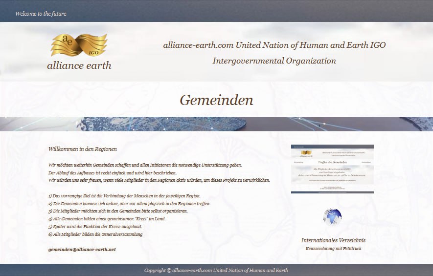 alliance earth ist eine rechtsfähige Intergovernmental Organization (IGO) und eine völkerrechtliche Körperschaft des öffentlichen Rechts (KdöR). Die Organisation wurde im Jahre 2012 von 256 Menschen gegründet. Heute zählen Menschen aus über 50 Nationen zu unseren Mitgliedern. Die Organisation vereint den weltlichen und den spirituellen Bereich. Durch ihren Rechtsstand als IGO und gleichzeitig als völkerrechtliche KdöR im Bereich des Religionsverfassungsrechts, verwaltet sie eigene Staatsangehörigkeiten und die dazugehörigen Gebietsrechte, besitzt eine eigenständige und unantastbare Verwaltung und ist grundgesetzberechtigt, aber nicht grundgesetzverpflichtet. Sie erlässt für ihre Mitglieder eigene Gesetze, auf der Grundlage ihrer Verfassung, die als Manifest veröffentlicht ist. Jede Kultur ist wertvoll. Machen wir uns auf den Weg, die Errungenschaften der Völker in einer multipolaren Welt zu erhalten. Das ist unsere Aufgabe. Mache es auch zu DEINER Aufgabe. Das gemeinsame Ziel ist eine weltweite Gemeinschaft in gegenseitigem Respekt, Frieden und Gerechtigkeit zwischen den Nationen, nach den Regeln des "Überpositiven Rechts".