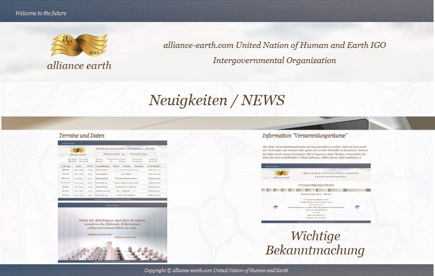 alliance-earth.com ist eine moderne und der Welt zugewandte, internationale und globale Organisation, die dennoch Platz für Besinnlichkeit, Güte, Menschlichkeit und ein tiefes Miteinander bietet. Alle Mitglieder gelten als lebende, geistige, beseelte und nicht verschollene Wesen und besitzen die unveräußerlichen Rechte der Schöpfung, die durch kein juristisches Recht verändert, aufgehoben oder eingeschränkt werden können. alliance-earth.com richtet sich gegen Rassenhass, Spaltung, Bevormundung, faschistische Entwicklungen, fanatische Religionslehren und vermittelt Wissen aus vielen Bereichen.