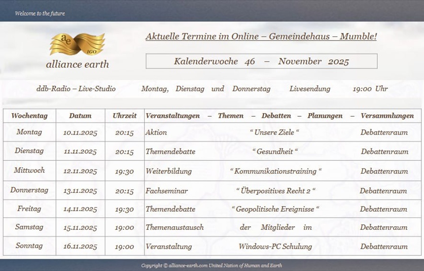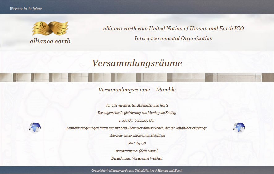 "alliance earth ist eine rechtsfähige Intergovernmental Organization (IGO) und eine völkerrechtliche Körperschaft des öffentlichen Rechts (KdöR). Die Organisation wurde im Jahre 2012 von 256 Menschen gegründet. Heute zählen Menschen aus über 50 Nationen zu unseren Mitgliedern. Die Organisation vereint den weltlichen und den spirituellen Bereich. Durch ihren Rechtsstand als IGO und gleichzeitig als völkerrechtliche KdöR im Bereich des Religionsverfassungsrechts, verwaltet sie eigene Staatsangehörigkeiten und die dazugehörigen Gebietsrechte, besitzt eine eigenständige und unantastbare Verwaltung und ist grundgesetzberechtigt, aber nicht grundgesetzverpflichtet. Sie erlässt für ihre Mitglieder eigene Gesetze, auf der Grundlage ihrer Verfassung, die als Manifest veröffentlicht ist. Jede Kultur ist wertvoll. Machen wir uns auf den Weg, die Errungenschaften der Völker in einer multipolaren Welt zu erhalten. Das ist unsere Aufgabe. Mache es auch zu DEINER Aufgabe. Das gemeinsame Ziel ist eine weltweite Gemeinschaft in gegenseitigem Respekt, Frieden und Gerechtigkeit zwischen den Nationen, nach den Regeln des "Überpositiven Rechts"."