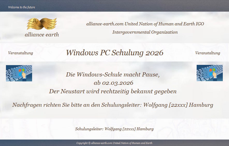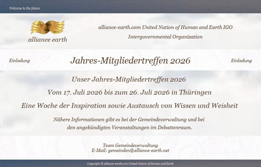 zuerst einmal bedankt sich die Verwaltung für die rege Diskussion über den richtigen Weg, den alliance earth gehen wird. Es ist sehr schnell klar und spürbar geworden. alliance earth bleibt auf seiner bisherigen Linie und steigt nicht tiefer in politische Prozesse ein, sofern die Entwicklungen für alliance earth nicht von unmittelbarem Interesse sind und den Bestand der Organisation gefährden könnten. Die Bereiche, die uns unmittelbar betreffen und die den gesetzlichen Rechten entsprechen, werden natürlich weiterhin von uns mit allen Möglichkeiten verteidigt und erstritten. Wir werden sodann unseren Rechtsstand nicht ändern oder selbst staatliche Gebilde starten. Der Konsens und die Kooperation mit anderen Institutionen und Organisationen, wie mit einzelnen Menschen, bleiben weiterhin unser Bestreben, da sie zur Grundhaltung aller Mitglieder von alliance earth gehören. Wir haben zu dieser Erkenntnis unseren "Rundbrief" in Vorbereitung, dessen aktueller Stand schon einmal unter