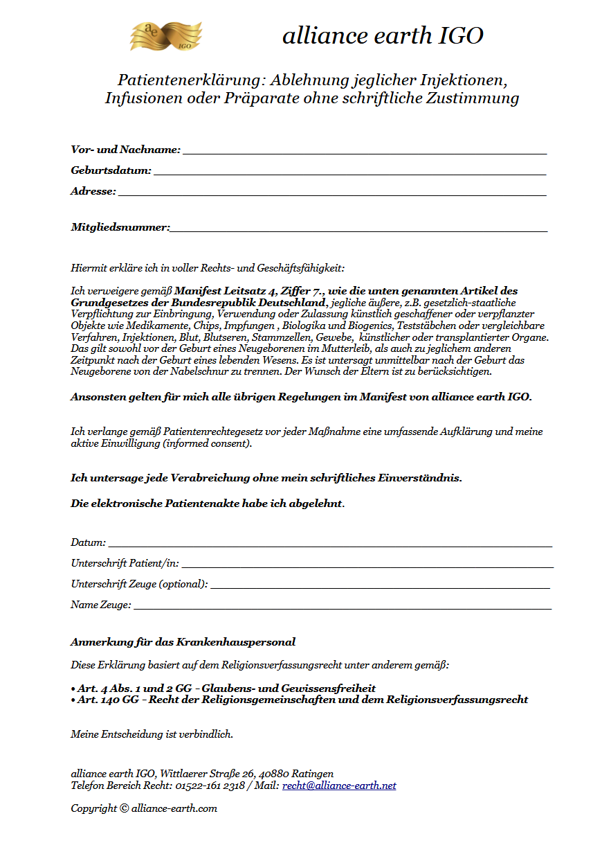 Bitte nicht vergessen: alliance earth IGO ist kein Mitglied der WHO. Durch die doppelte Staatsangehörigkeit ist somit ein Zugriff auf Mitglieder von alliance earth IGO nicht mehr gegeben. Diese Unterlage sollte immer in Verbindung mit unserem alliance earth IGO - Ausweis verwendet werden. Die genauen Auswirkungen wurden bereits erklärt, sollen aber gerne bei internen Veranstaltungen erneut besprochen werden. Unser Team ist entsprechend informiert.
